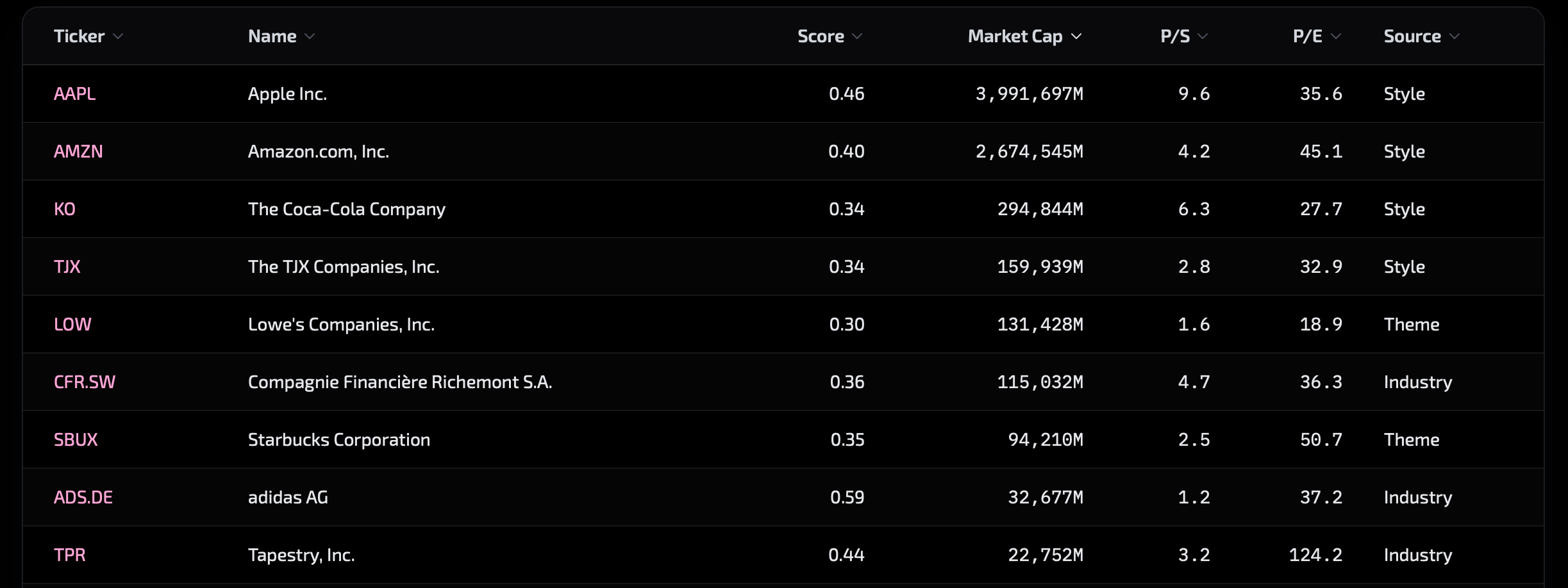 - Theme-based — narrative similarity and shared price action patterns that cut across sector lines. When a company trades more like an AI play than a legacy enterprise vendor, theme peering captures that. Powers the Theme model.